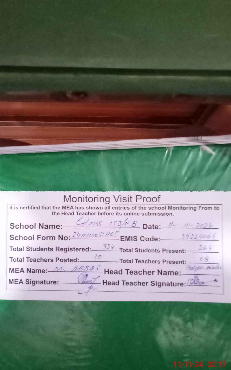 | EMIS Code: 39220069 | Name of School: GGHS 153 EB POST OFFICE CHAK NO 153 EB | |||