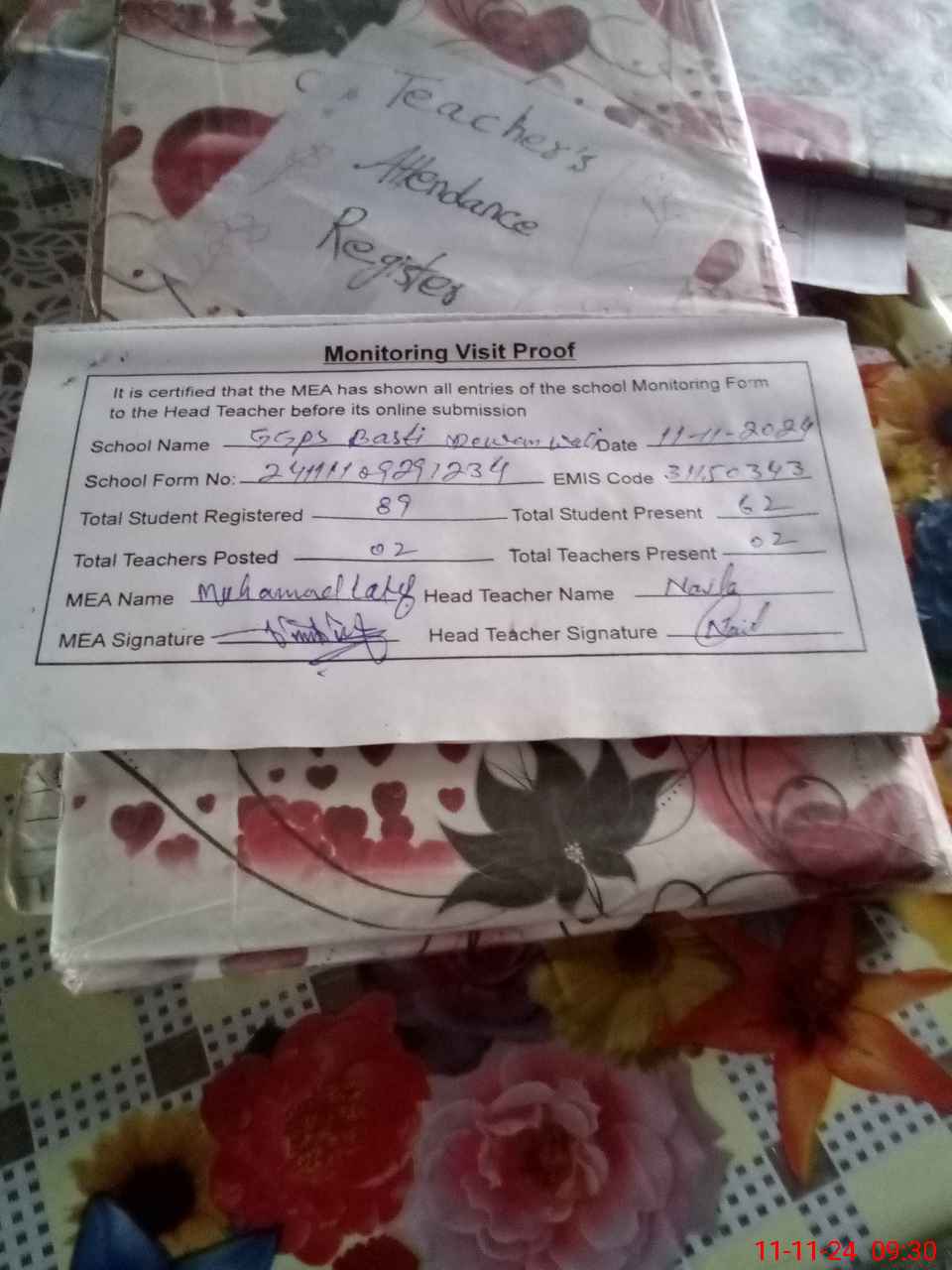 | Attendance Register | Head Teacher | MEA with School | Visit Proof |