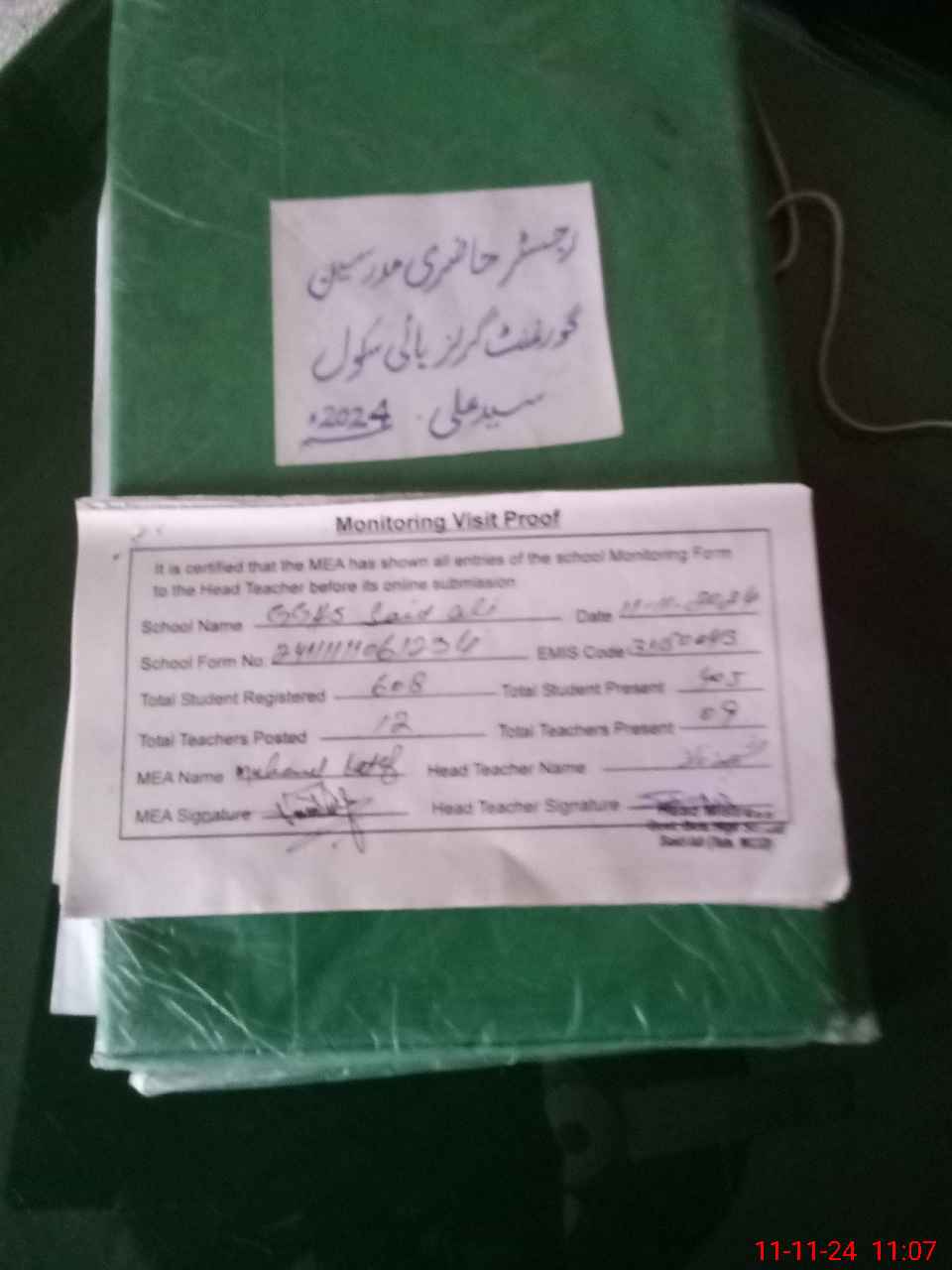 | Attendance Register | Head Teacher | MEA with School | Visit Proof |