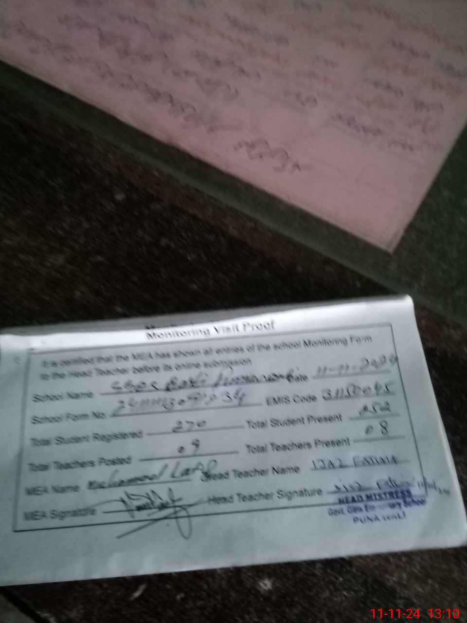 | Attendance Register | Head Teacher | MEA with School | Visit Proof |