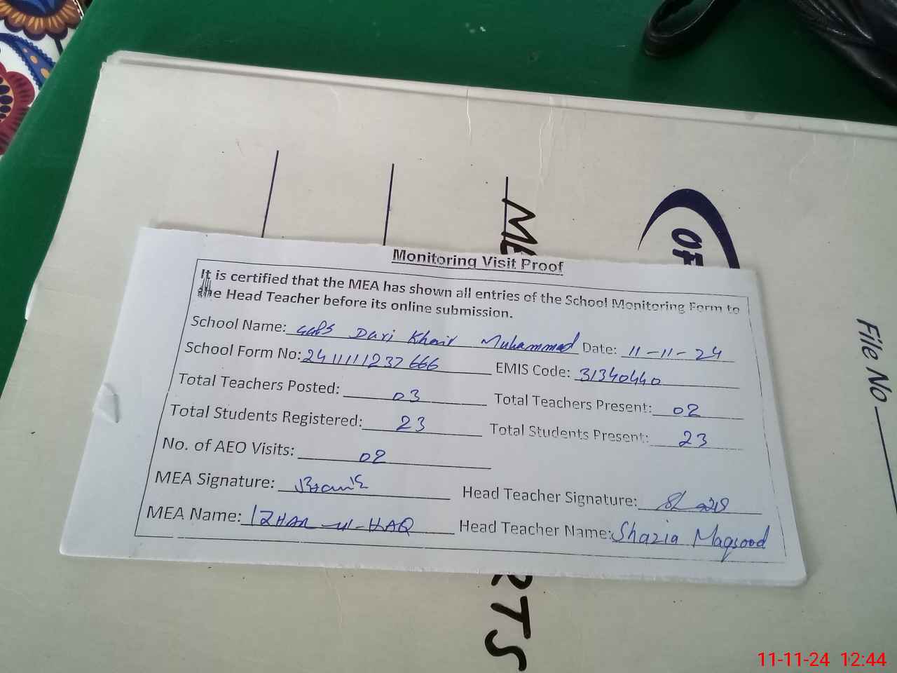 | Attendance Register | Head Teacher | MEA with School | Visit Proof |