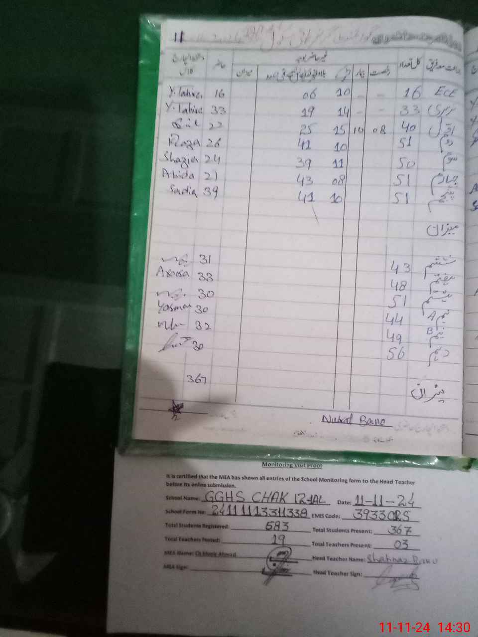 | Attendance Register | Head Teacher | MEA with School | Visit Proof |