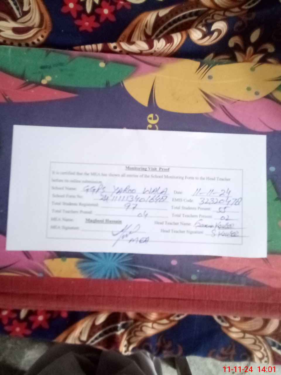 | Attendance Register | Head Teacher | MEA with School | Visit Proof |