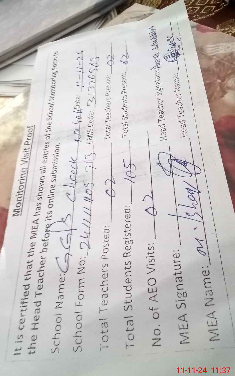 | Attendance Register | Head Teacher | MEA with School | Visit Proof |