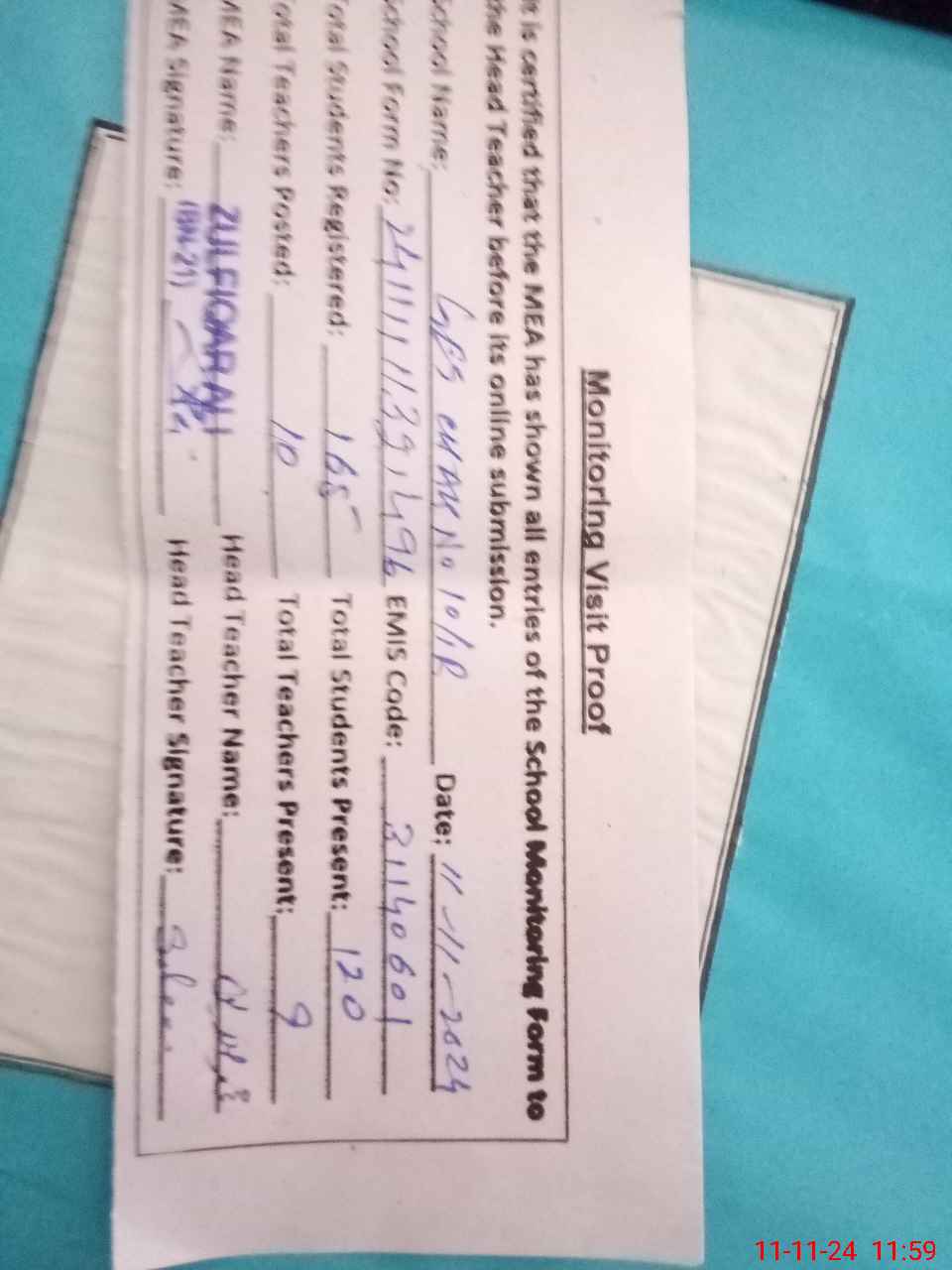 | Attendance Register | Head Teacher | MEA with School | Visit Proof |