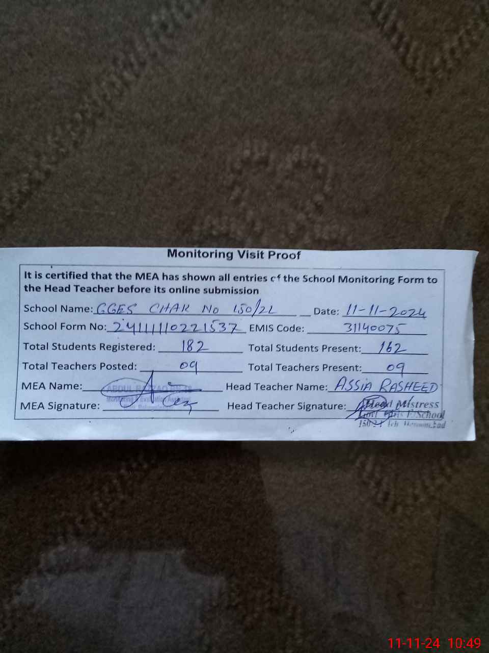 | Certified that this School was Inspected by the Undersigned MEA/DMO Today and the Information Stated Above is as Per Record. | |||||