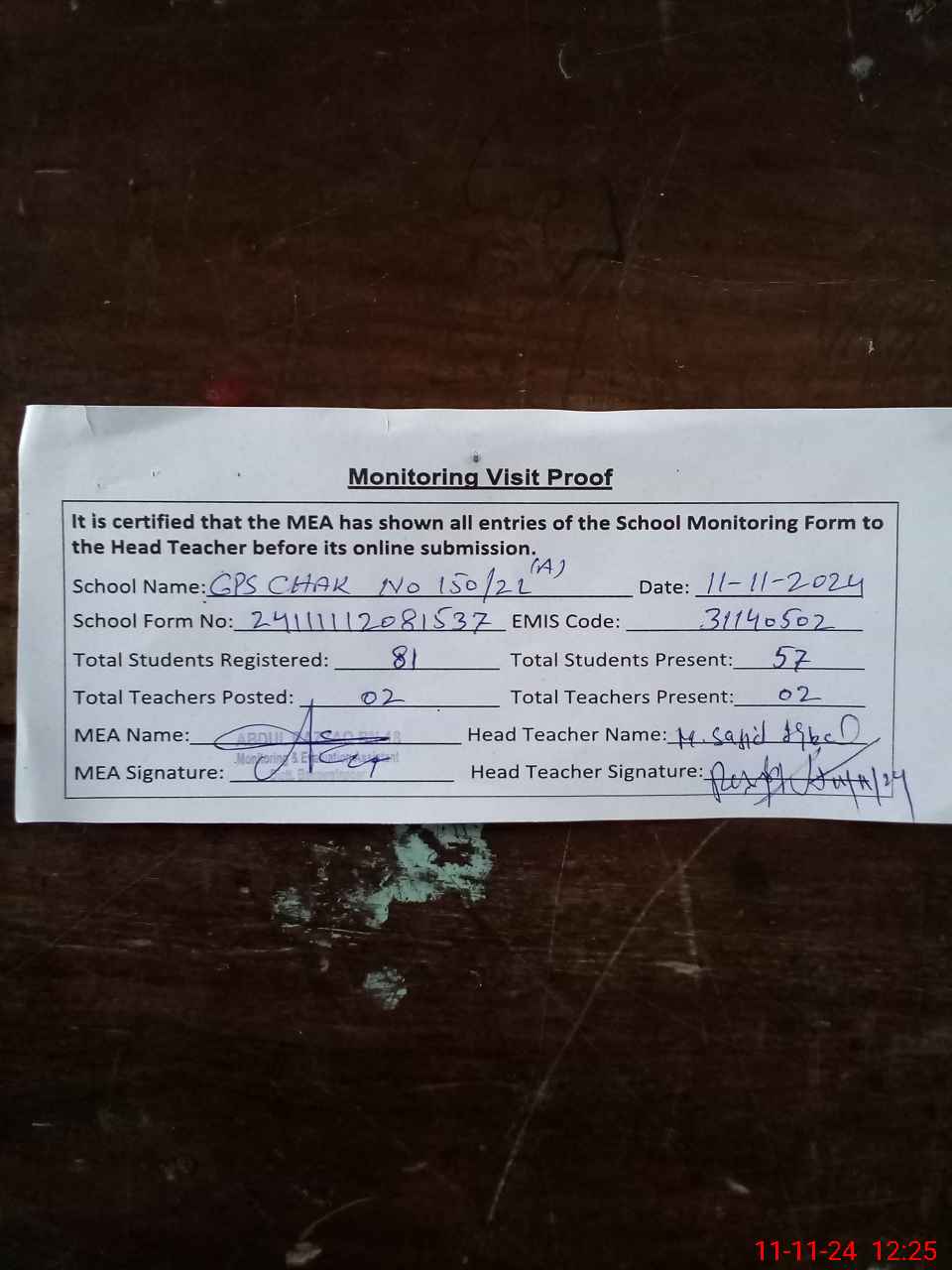 | Attendance Register | Head Teacher | MEA with School | Visit Proof |