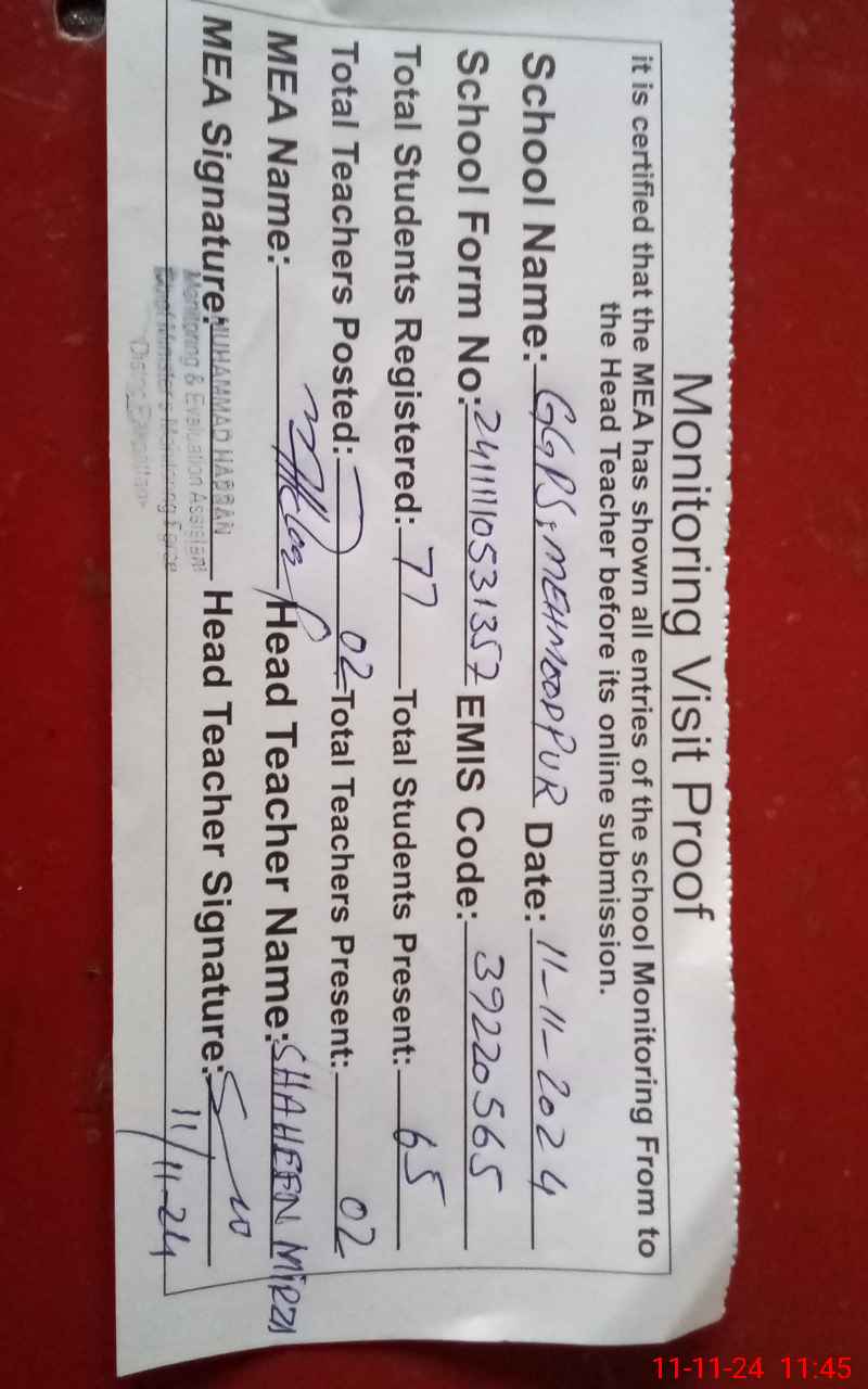 | EMIS Code: 39220565 | Name of School: GGPS MEHMOOD PUR | |||