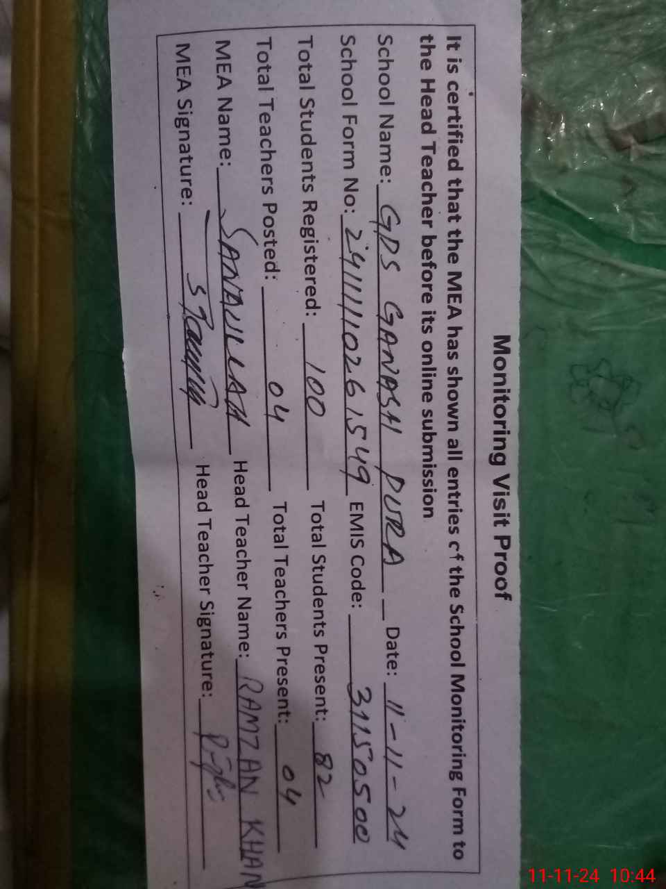 | EMIS Code: 31150500 | Name of School: GPS GANASH PURA MINCHINABAD | |||
