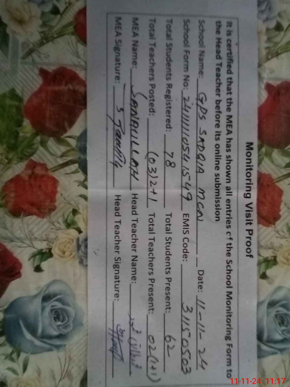 | Certified that this School was Inspected by the Undersigned MEA/DMO Today and the Information Stated Above is as Per Record. | |||||