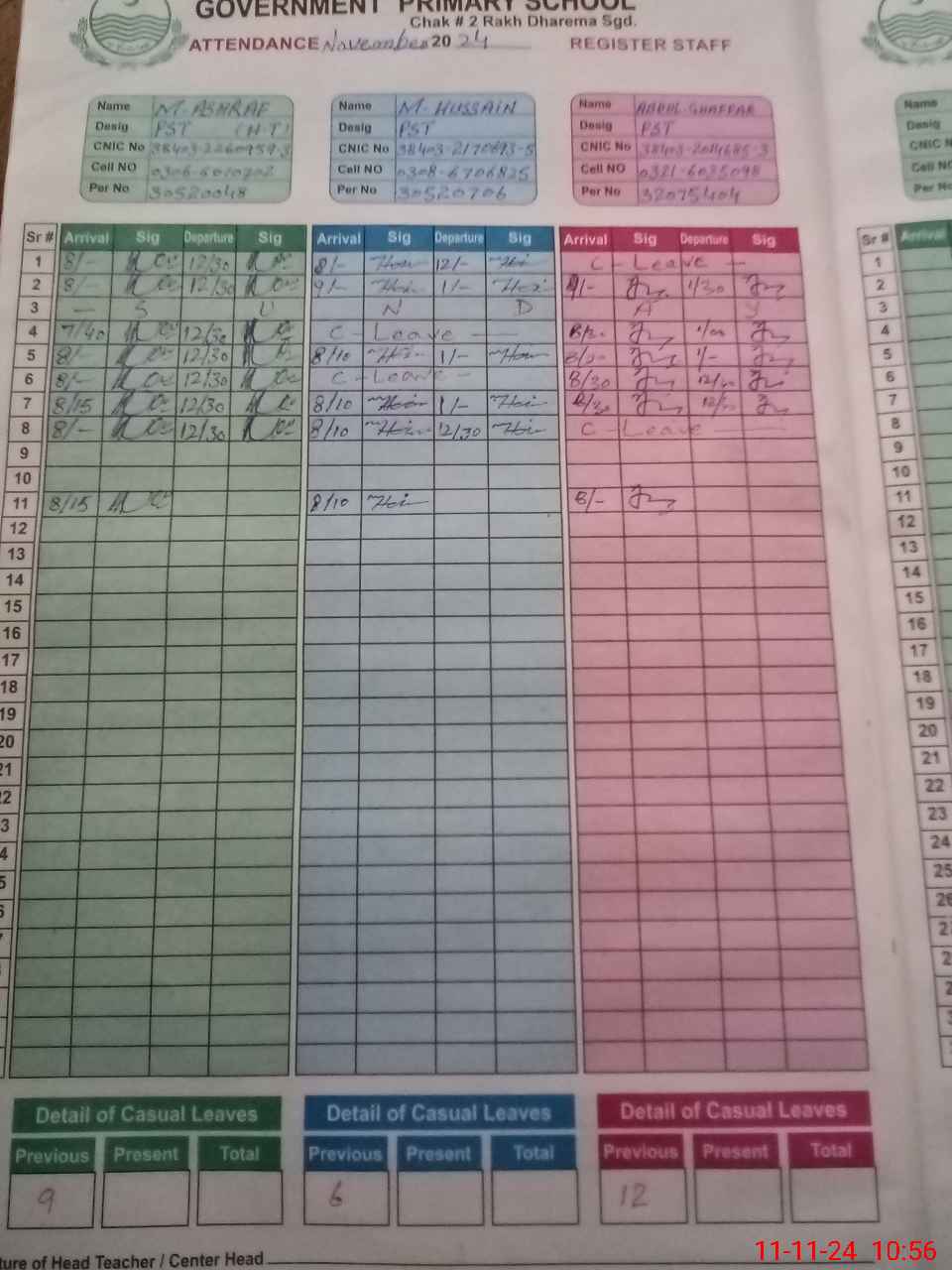 | CNIC | Full Name | Designation | R/C | Absence during last cal. month |
