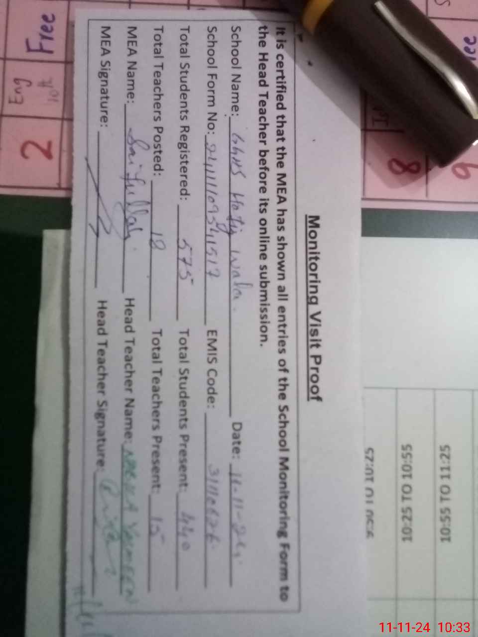 | Attendance Register | Head Teacher | MEA with School | Visit Proof |