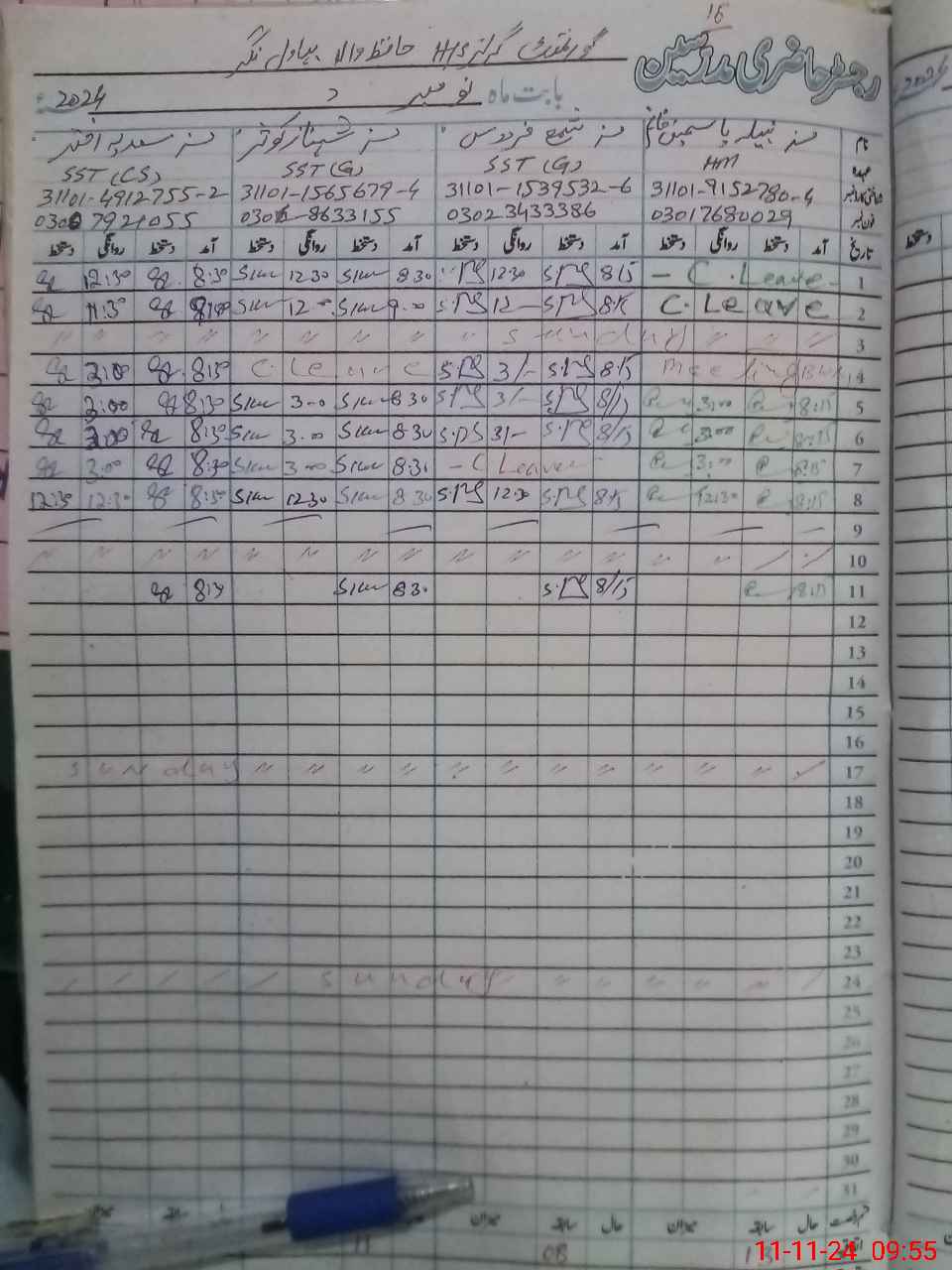 | CNIC | Full Name | Designation | R/C | Absence During Last Calender Month |
