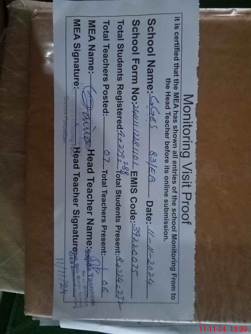 | Attendance Register | Head Teacher | MEA with School | Visit Proof |