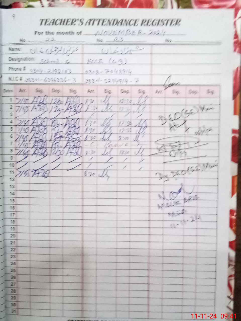 | CNIC | Full Name | Designation | R/C | Absence during last cal. month |