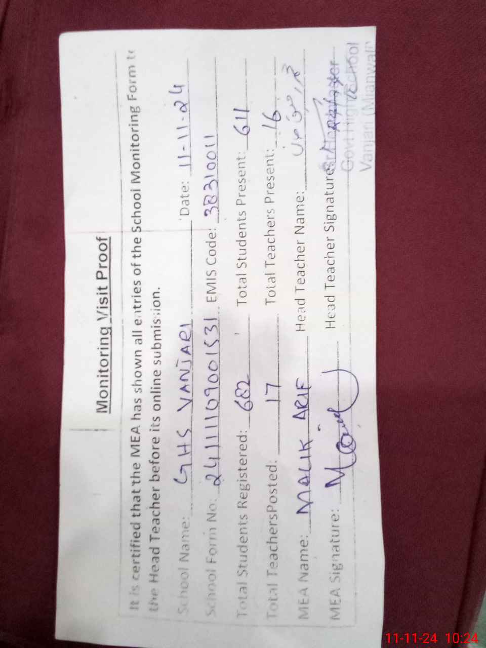 | Attendance Register | Head Teacher | MEA with School | Visit Proof |