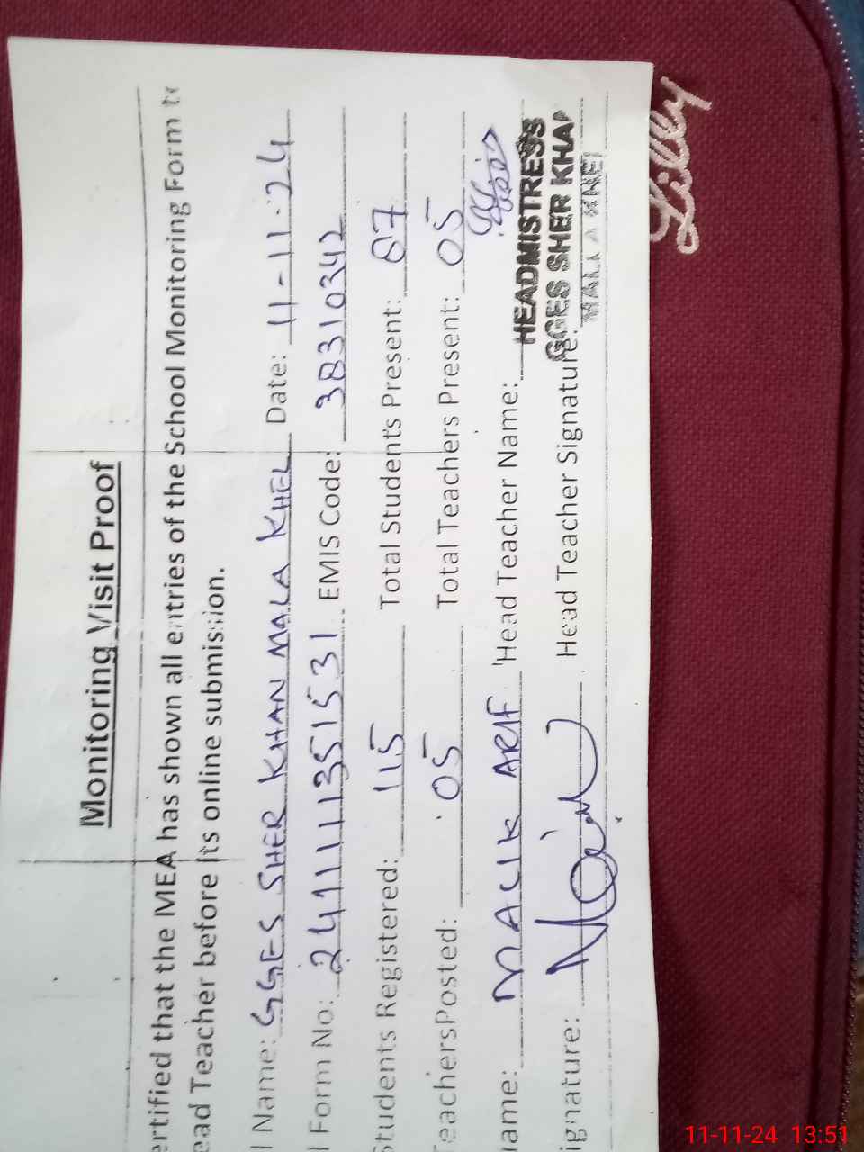 | EMIS Code: 38310342 | Name of School: GGES SHER KHAN MALLA KHEL | |||