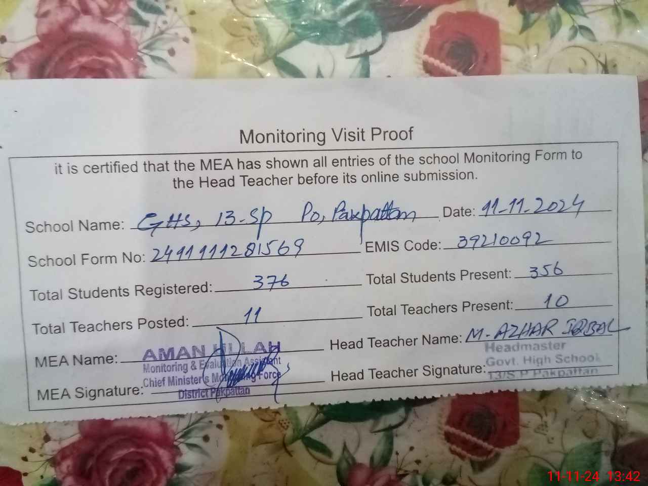 | Attendance Register | Head Teacher | MEA with School | Visit Proof |
