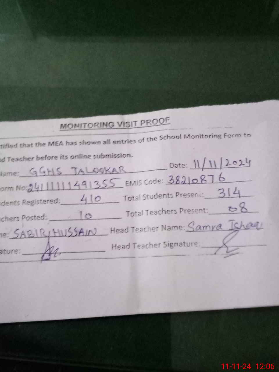 | Attendance Register | Head Teacher | MEA with School | Visit Proof |