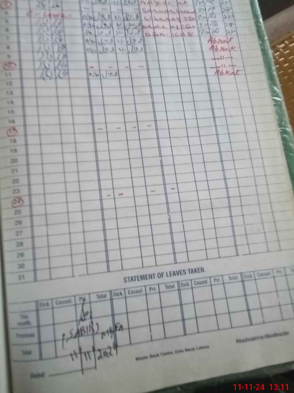 | CNIC | Full Name | Designation | R/C | Absence During Last Calender Month |