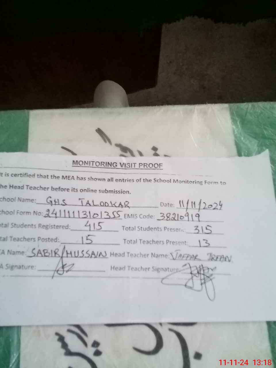 | Attendance Register | Head Teacher | MEA with School | Visit Proof |