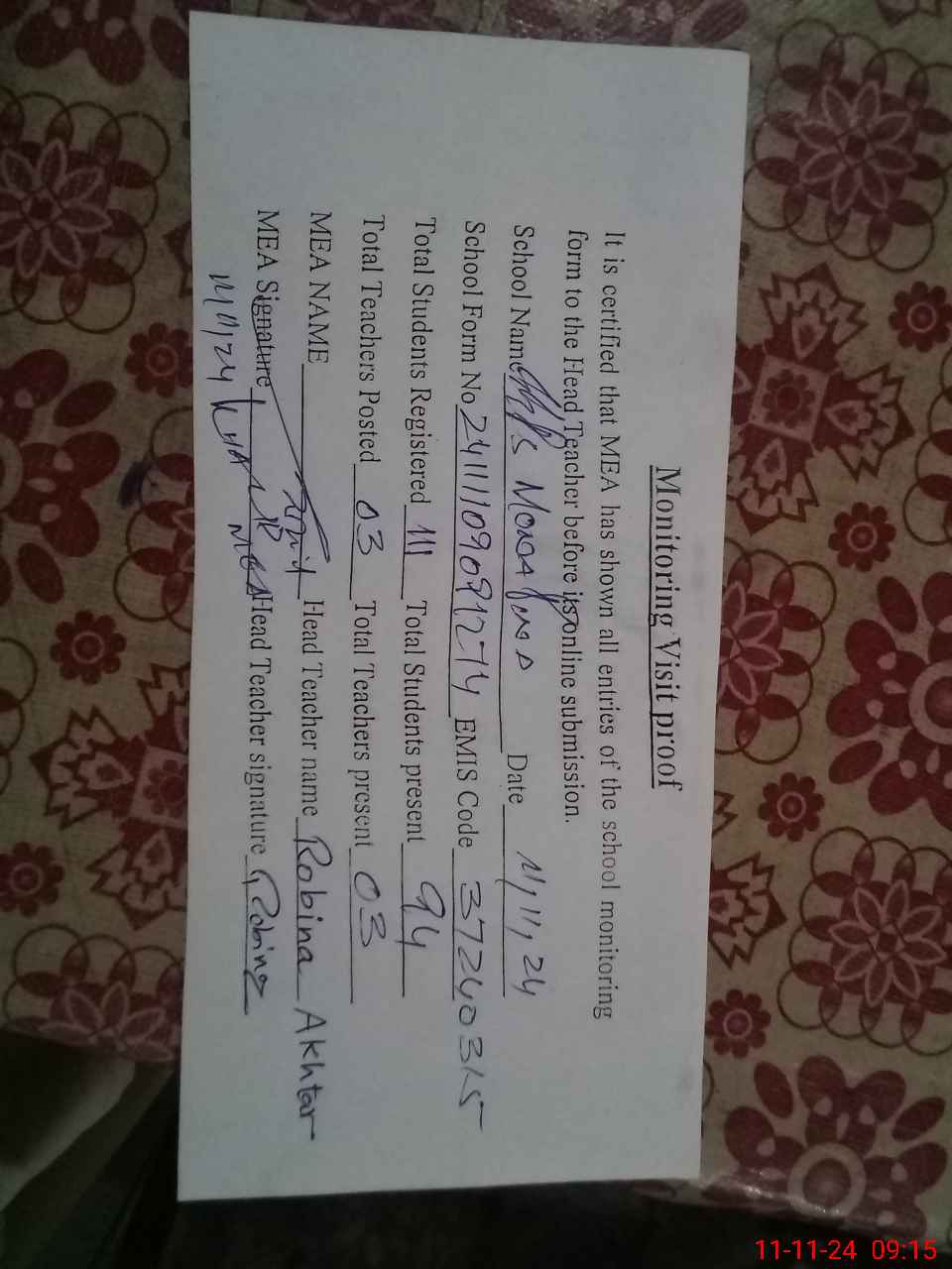 | Monitoring Date: 11-11-2024 | Start Time: 11-11-2024 08:56 AM | End Time: 11-11-2024 09:31 AM | Name of MEA: KH**** ME**** | |