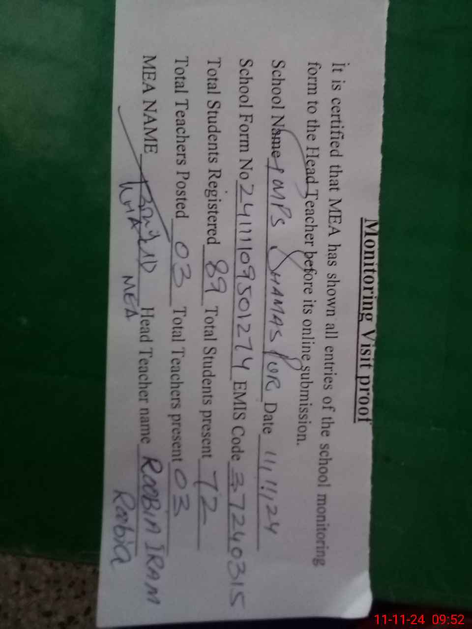 | Attendance Register | Head Teacher | MEA with School | Visit Proof |