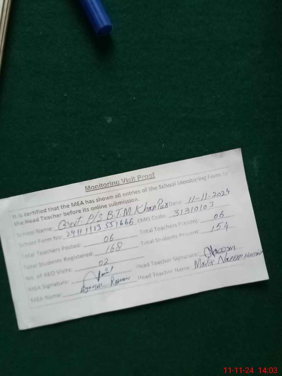 | Attendance Register | Head Teacher | MEA with School | Visit Proof |