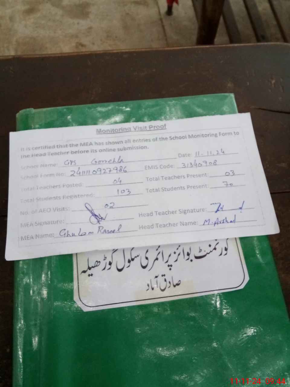 | Attendance Register | Head Teacher | MEA with School | Visit Proof |