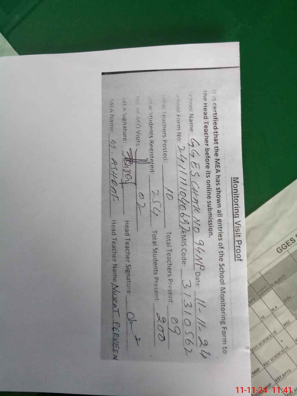 | Attendance Register | Head Teacher | MEA with School | Visit Proof |