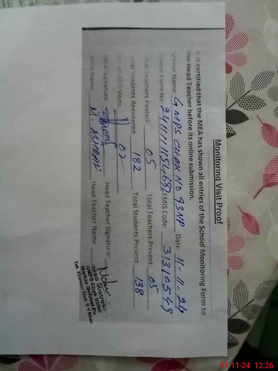 | EMIS Code: 31310549 | Name of School: GMPS CHAK NO. 93/NP (After Noon) | |||