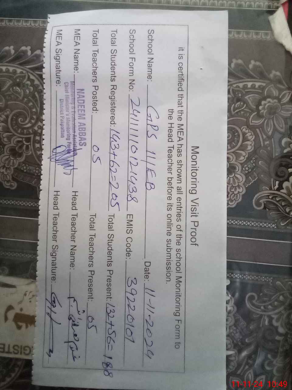 | Certified that this School was Inspected by the Undersigned MEA/DMO Today and the Information Stated Above is as Per Record. | |||||
