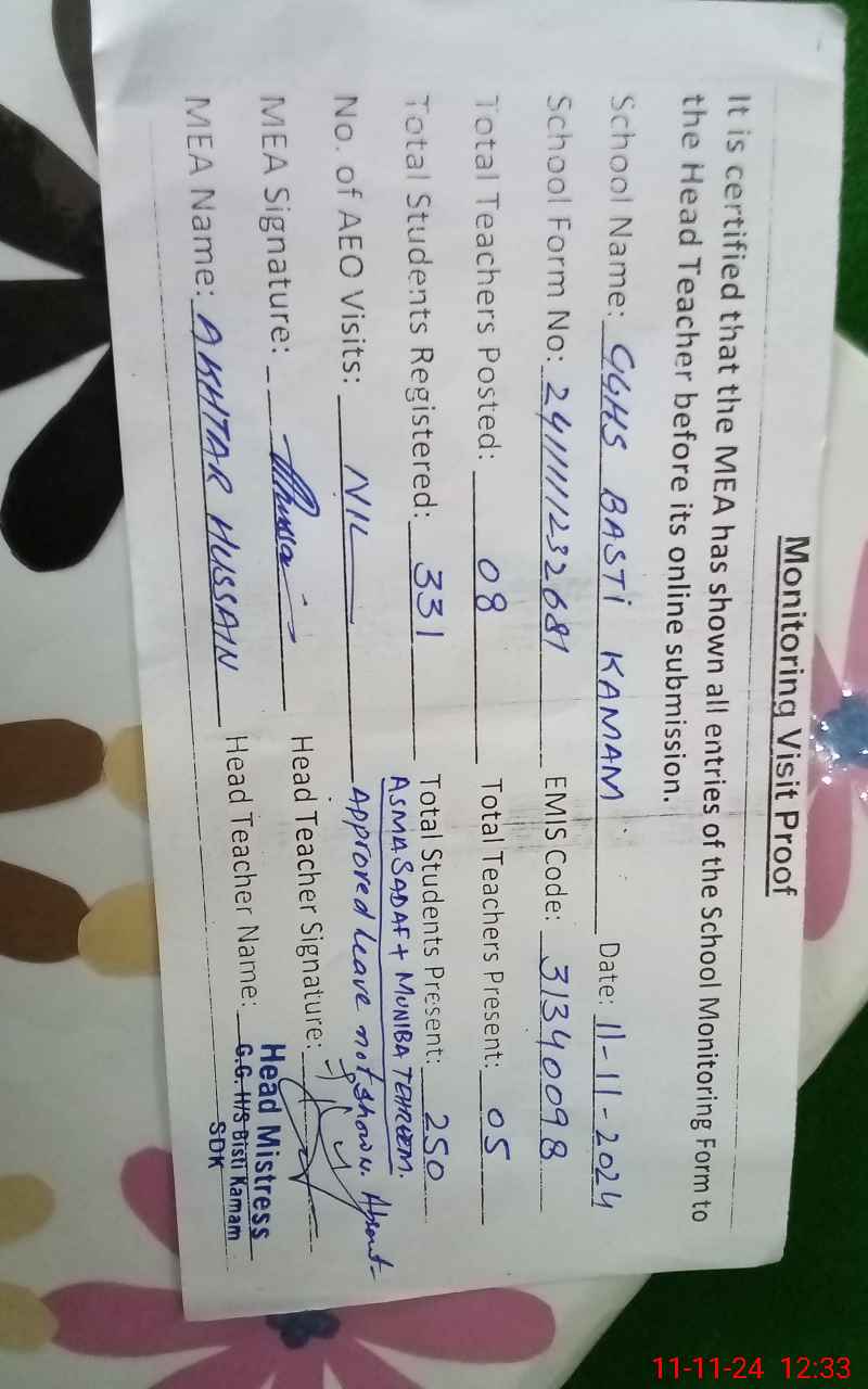 | EMIS Code: 31340098 | Name of School: GGHS BASTI KAMAM | |||