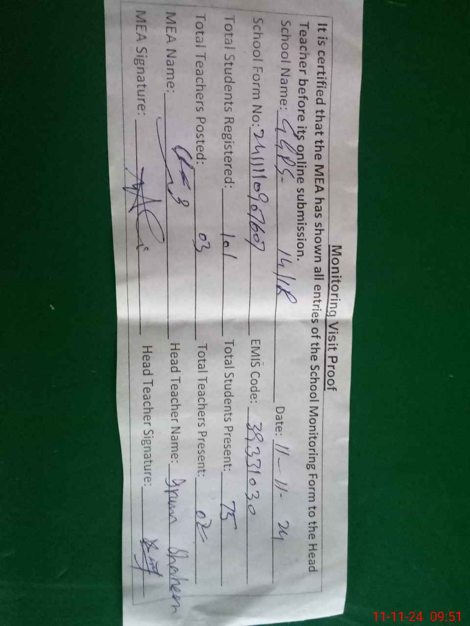 | Attendance Register | Head Teacher | MEA with School | Visit Proof |