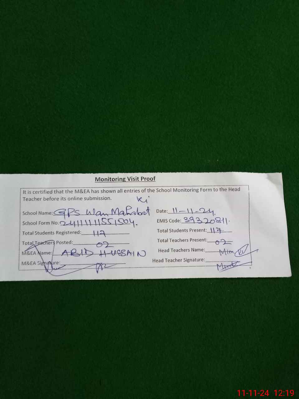 | Attendance Register | Head Teacher | MEA with School | Visit Proof |
