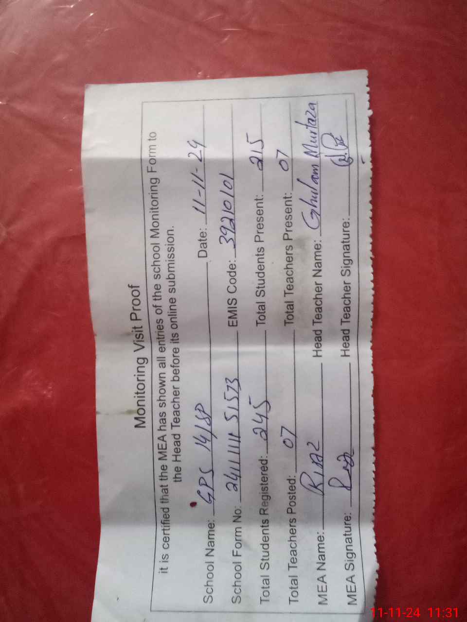 | EMIS Code: 39210101 | Name of School: GPS 14-SP P.O PAKPATTAN | |||