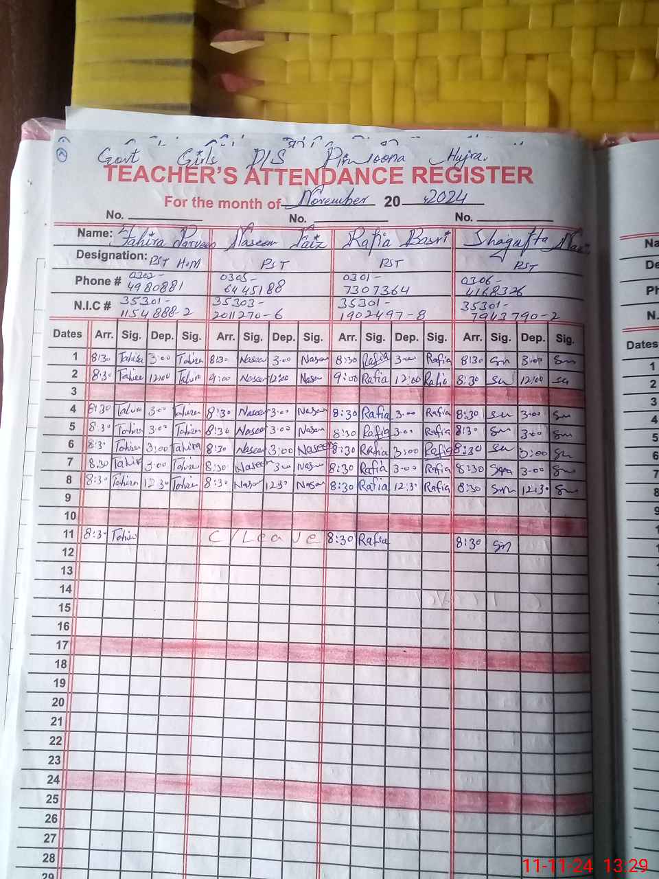 | CNIC | Full Name | Designation | R/C | Absence During Last Calender Month |