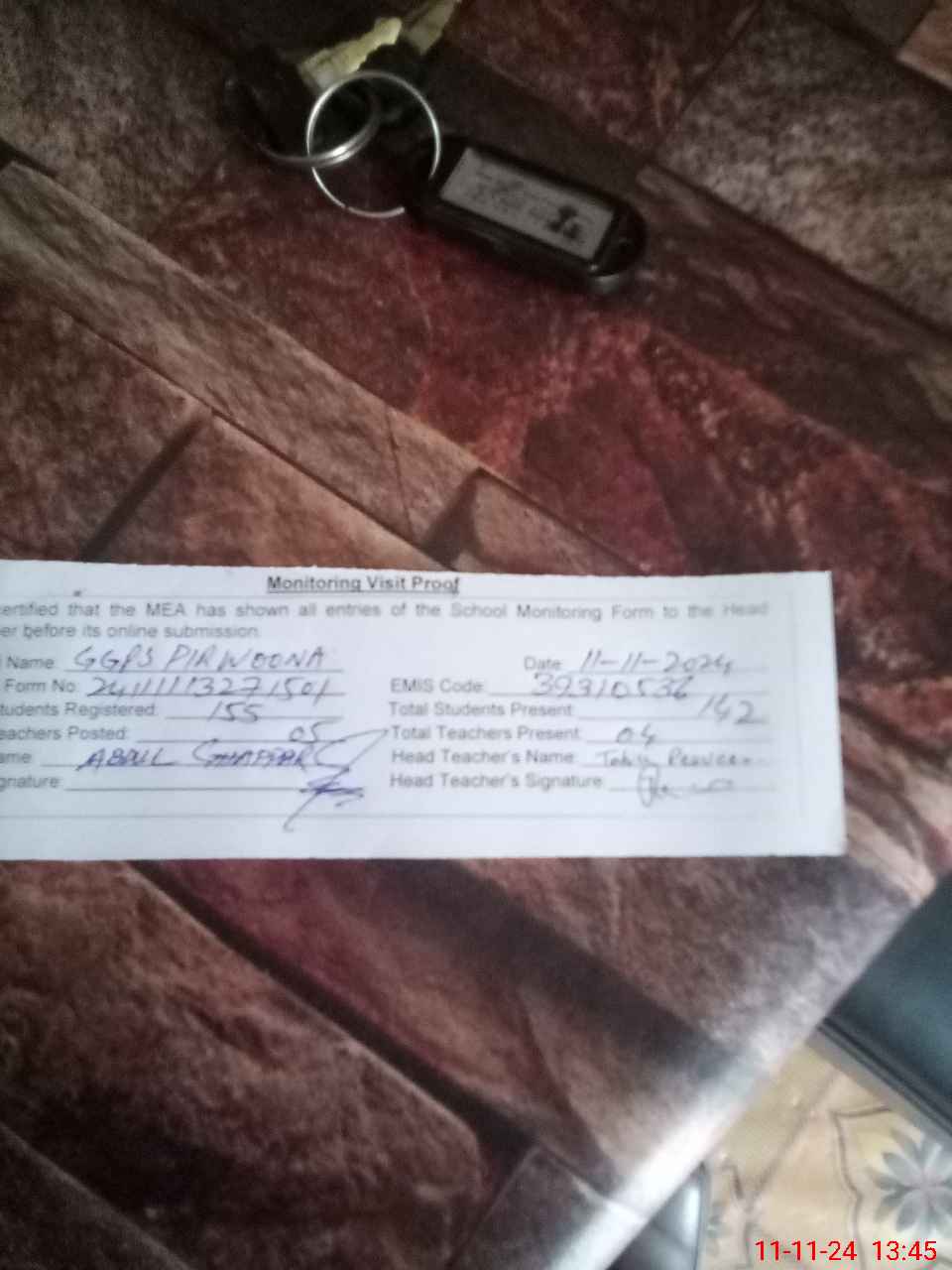 | Attendance Register | Head Teacher | MEA with School | Visit Proof |