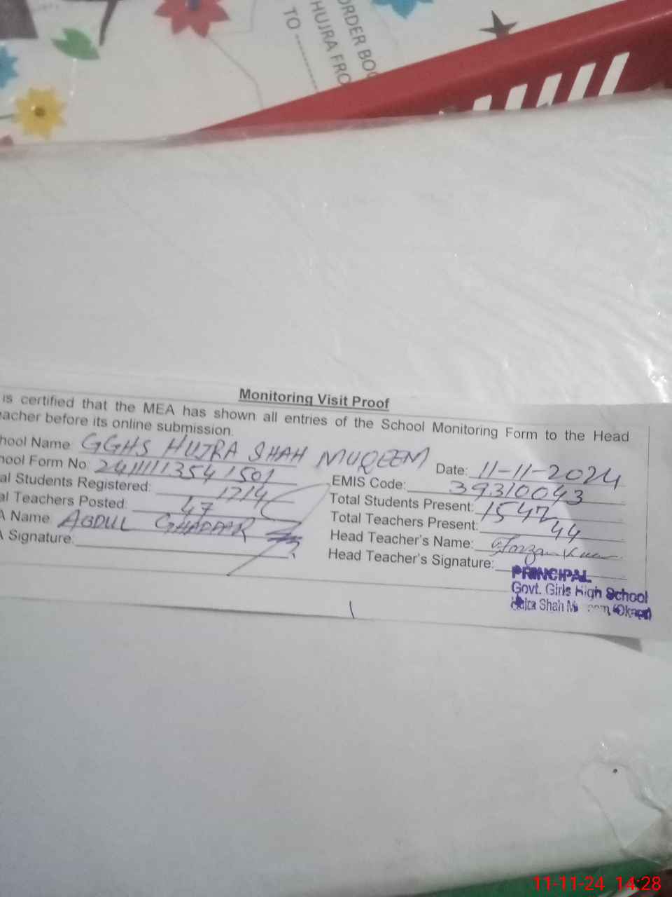 | EMIS Code: 39310043 | Name of School: GGHS HUJRA SHAH MUQEEM | |||
