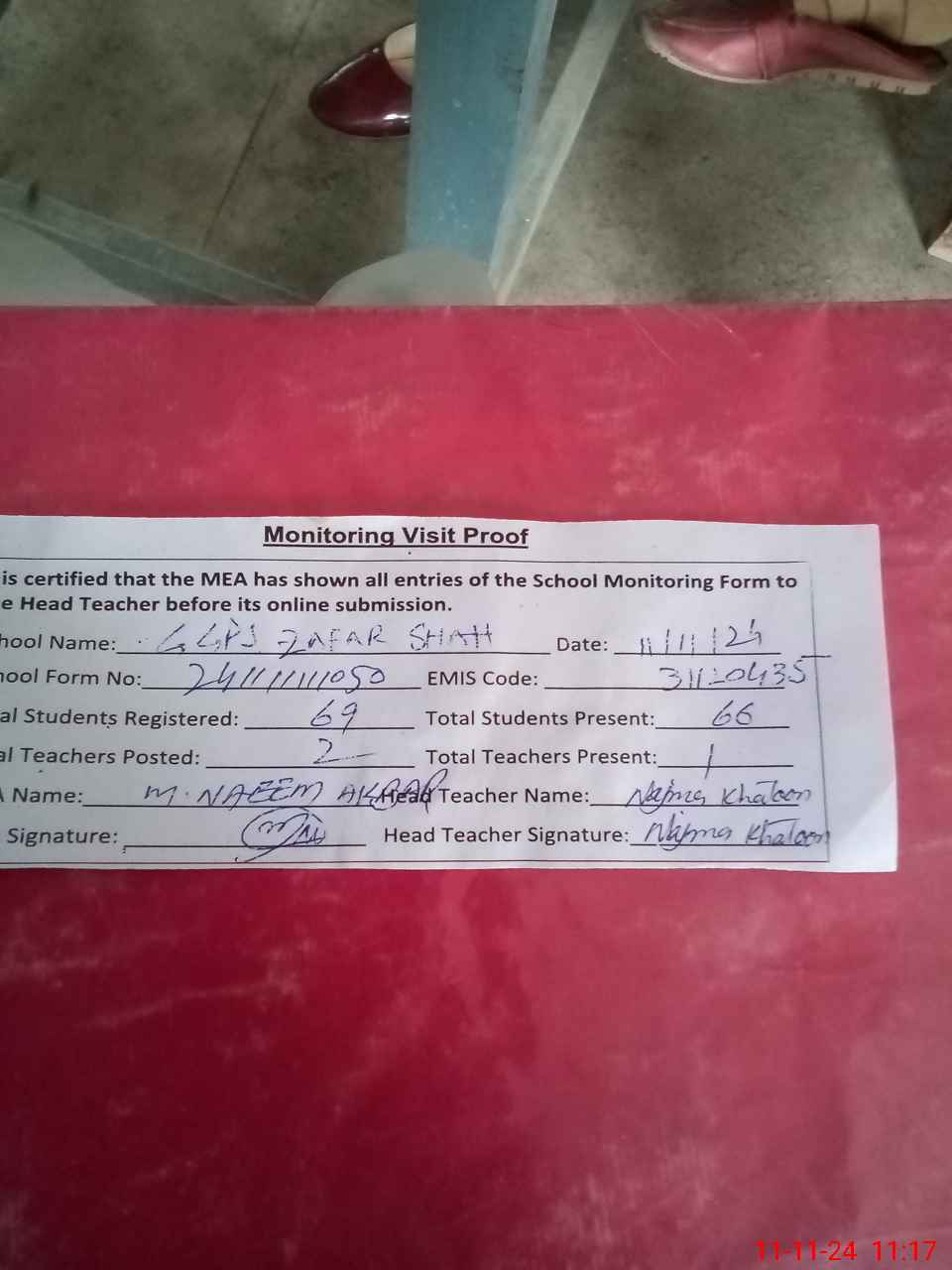 | Attendance Register | Head Teacher | MEA with School | Visit Proof |