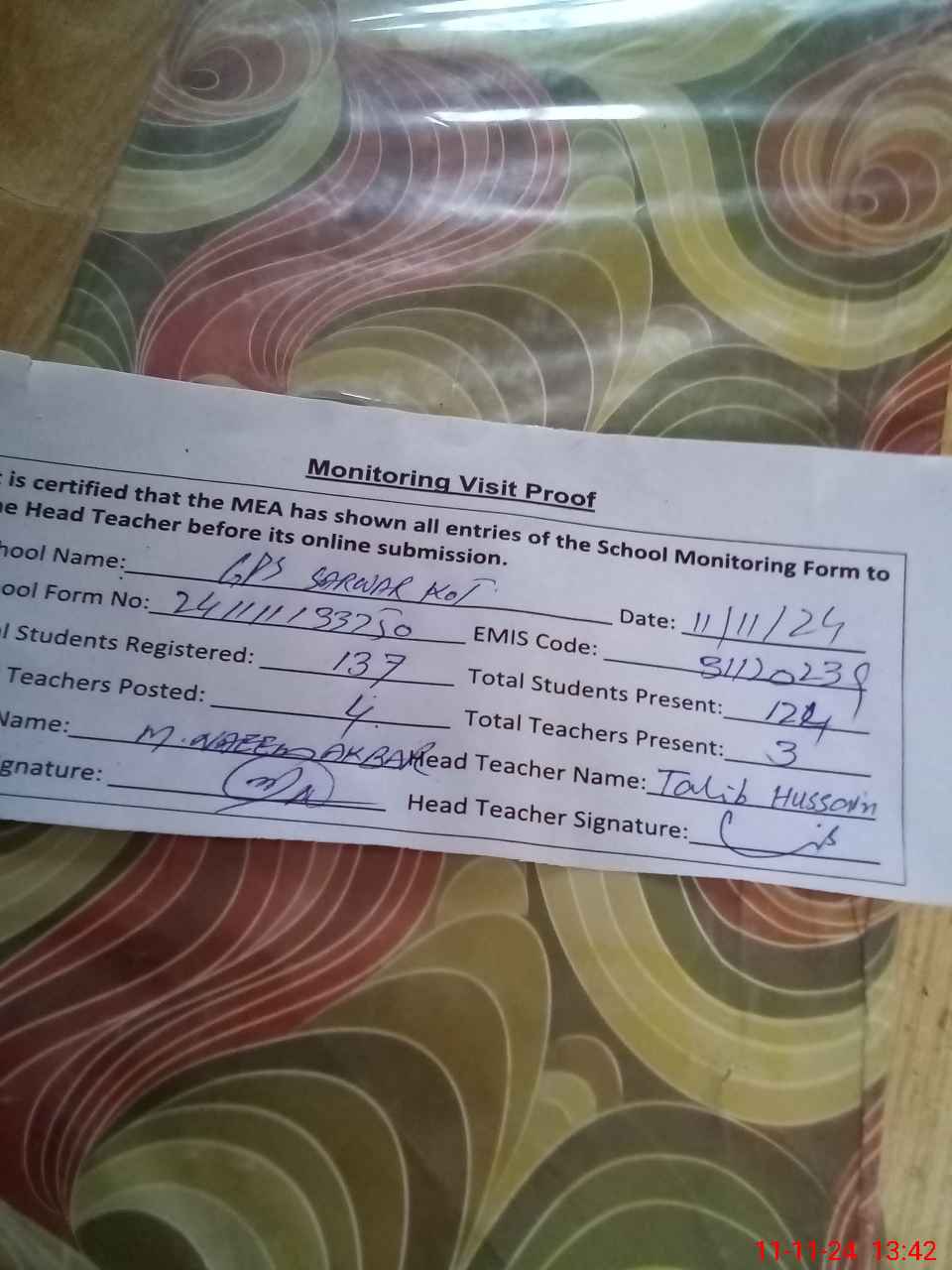 | Attendance Register | Head Teacher | MEA with School | Visit Proof |