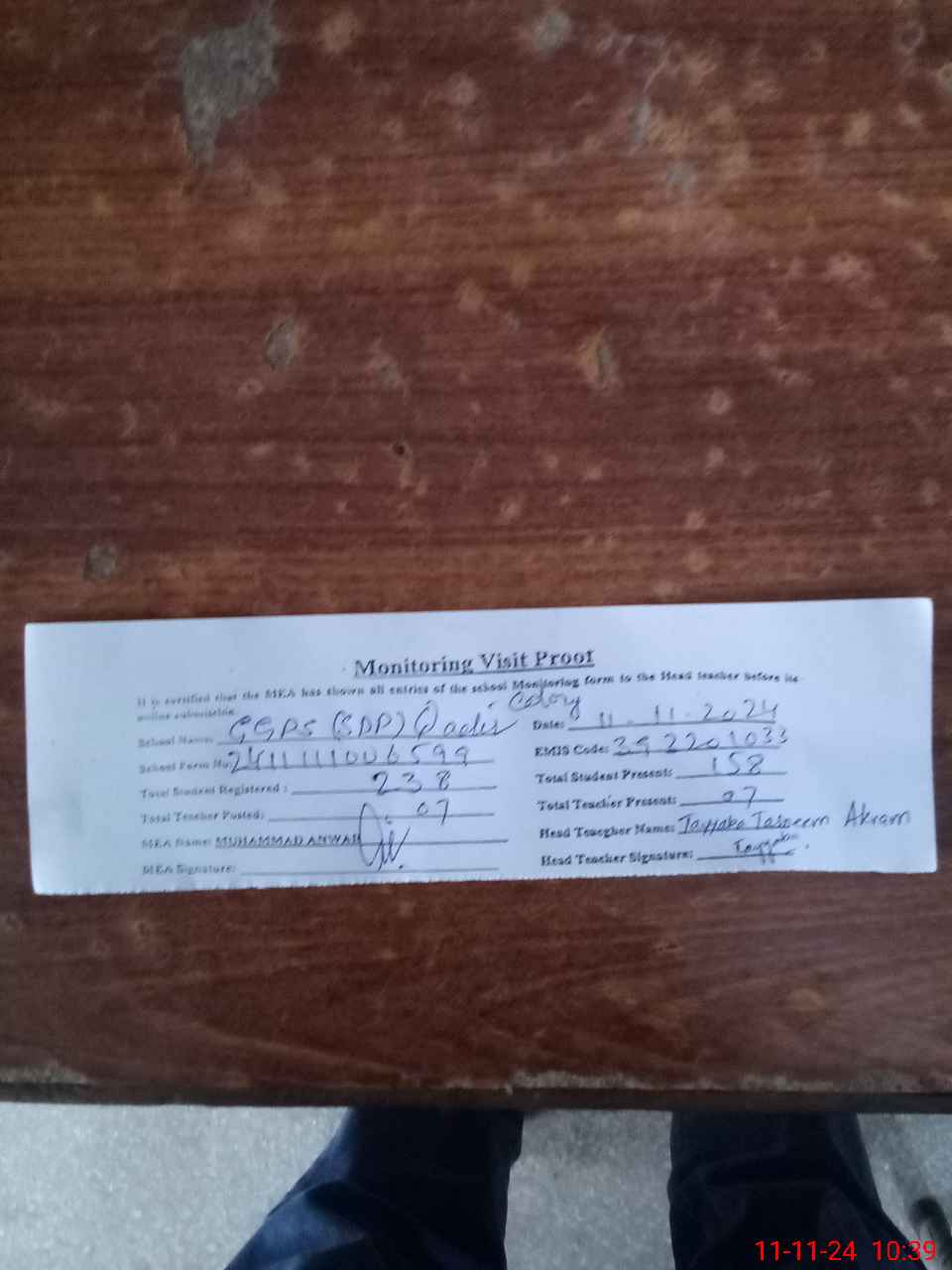 | Attendance Register | Head Teacher | MEA with School | Visit Proof |