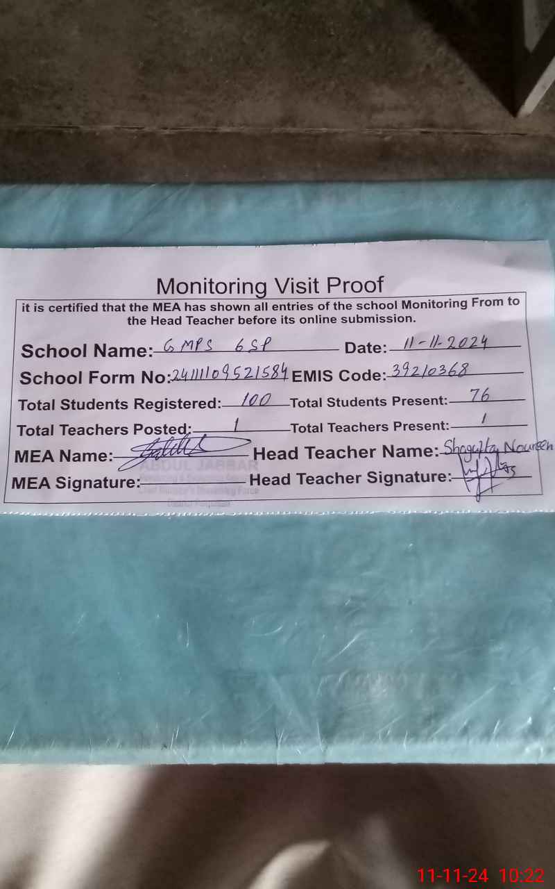 | Monitoring Date: 11-11-2024 | Start Time: 11-11-2024 09:52 AM | End Time: 11-11-2024 10:23 AM | Name of MEA: AB**** JA**** | |