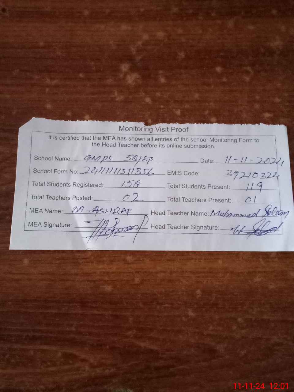 | Attendance Register | Head Teacher | MEA with School | Visit Proof |