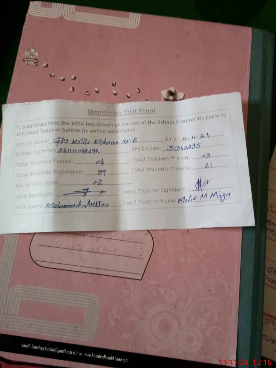 | Attendance Register | Head Teacher | MEA with School | Visit Proof |