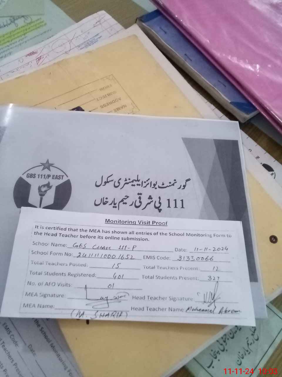 | EMIS Code: 31330066 | Name of School: GES CHAK NO. 111/P | |||