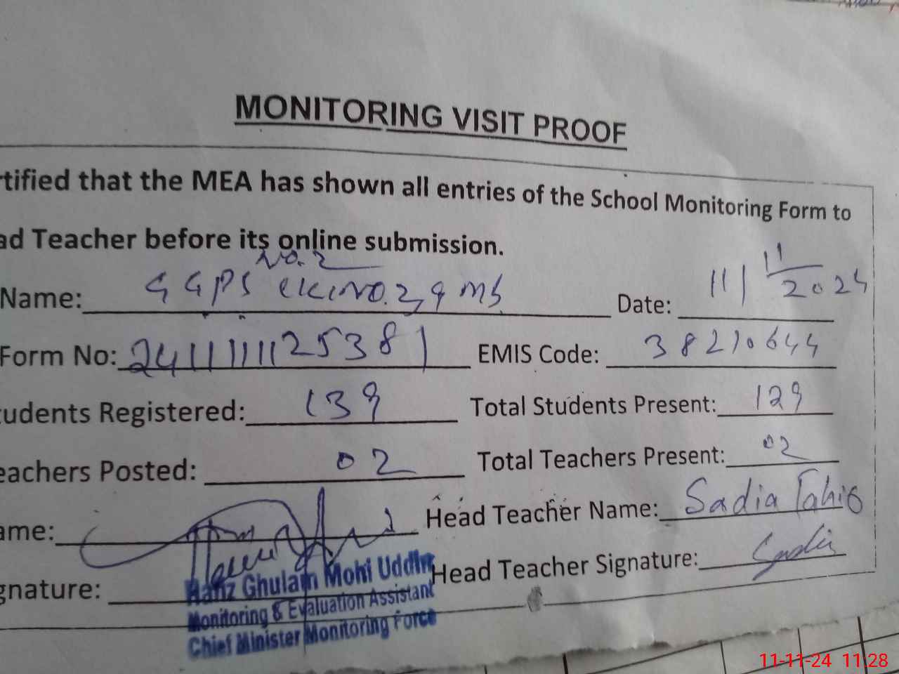 | Monitoring Date: 11-11-2024 | Start Time: 11-11-2024 11:12 AM | End Time: 11-11-2024 11:29 AM | Name of MEA: HA**** GH**** MO**** UDDI**** | |