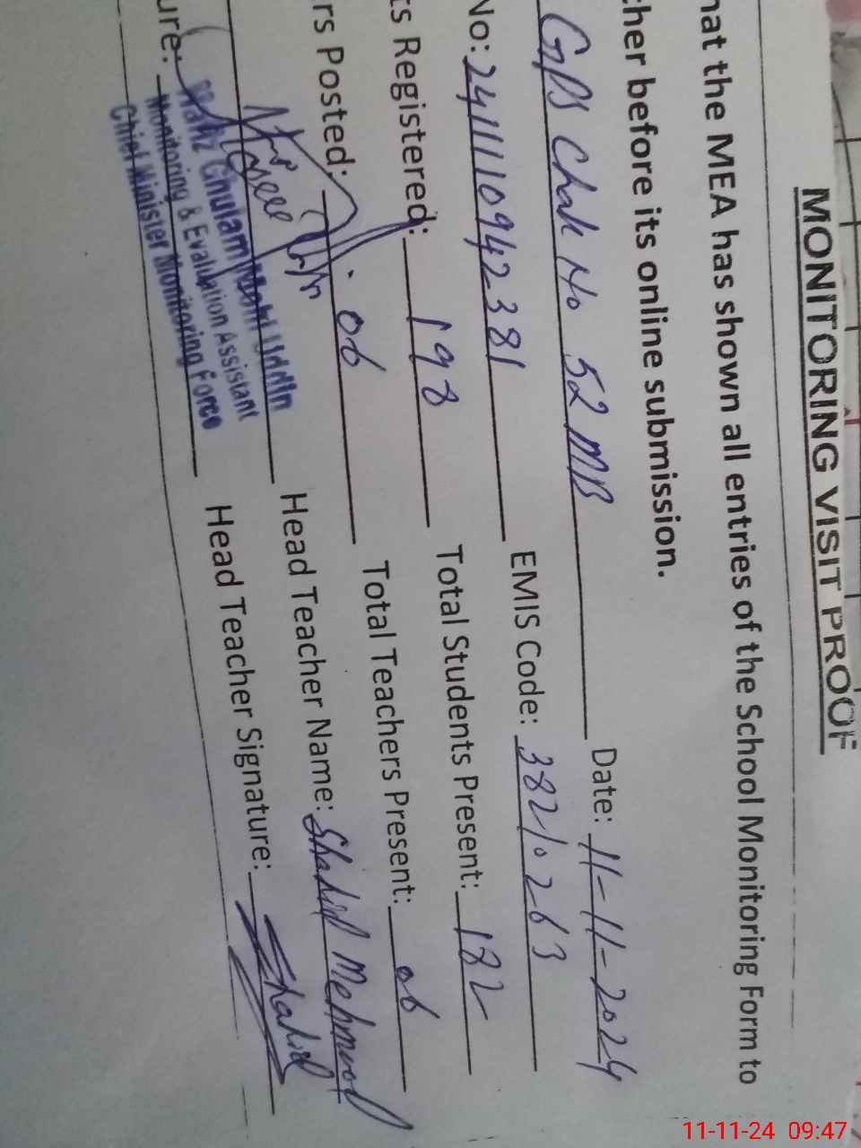 | Attendance Register | Head Teacher | MEA with School | Visit Proof |