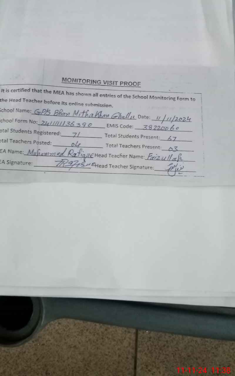 | EMIS Code: 38220060 | Name of School: GPS MITHA KHAN GHALL | |||