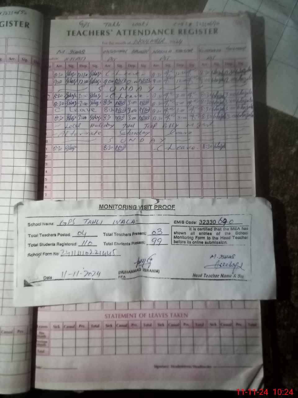 | Attendance Register | Head Teacher | MEA with School | Visit Proof |